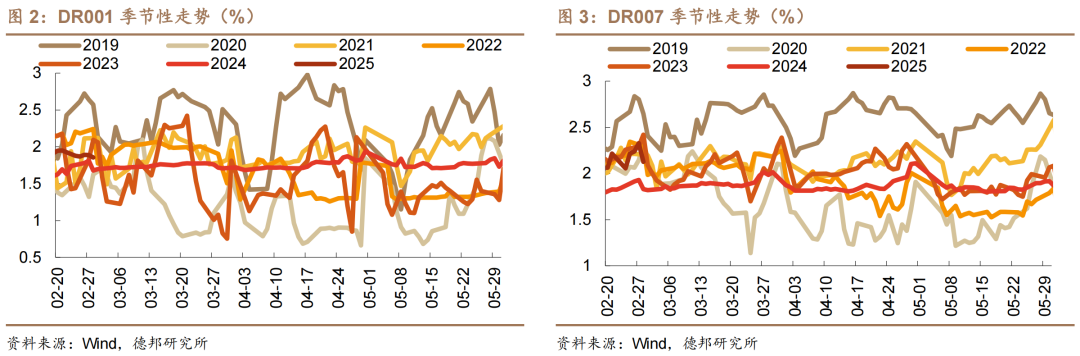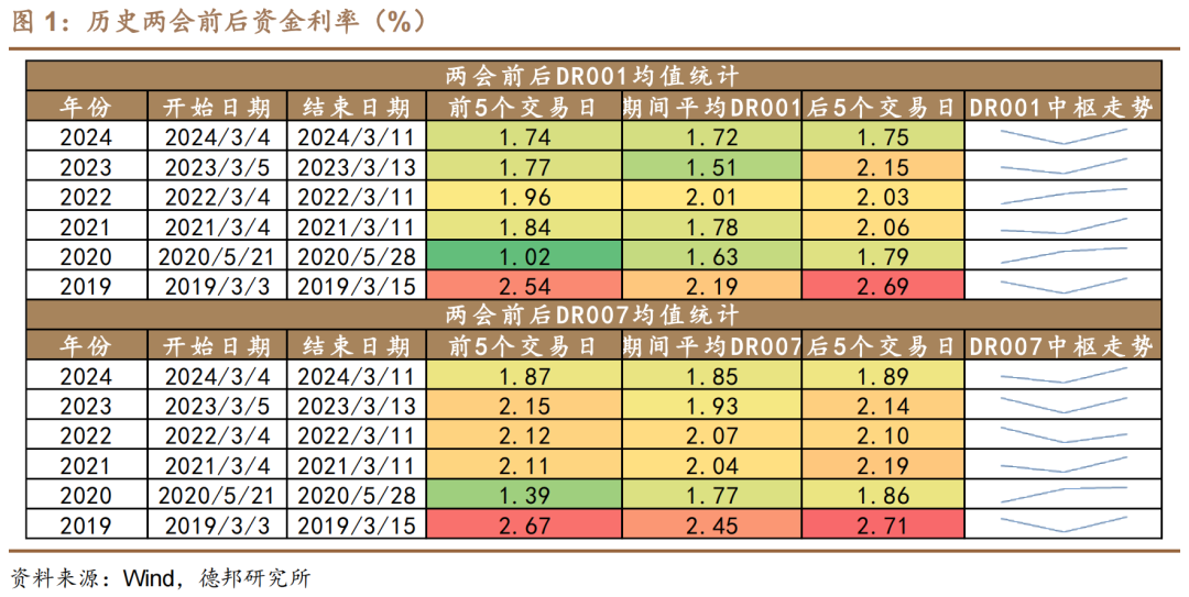 复盘2019年以来两会召开前后的资金面情况,无数年份在会议时间资金利率发达走低。除2022年和2020年之外,其余年份从两会召开前到两会召开后,资金利率资历先下后上的变化趋势,基本上在两会召开时间资金利率相对牢固,近两年两会时间DR007价钱核心都在2%以下,从目下来看,资金价钱全体偏高,收尾2月28日,DR001和DR007为1.86%和2.13%,相较前年年末辨别上行了20BP和15BP,处于资金价钱偏高阵势。