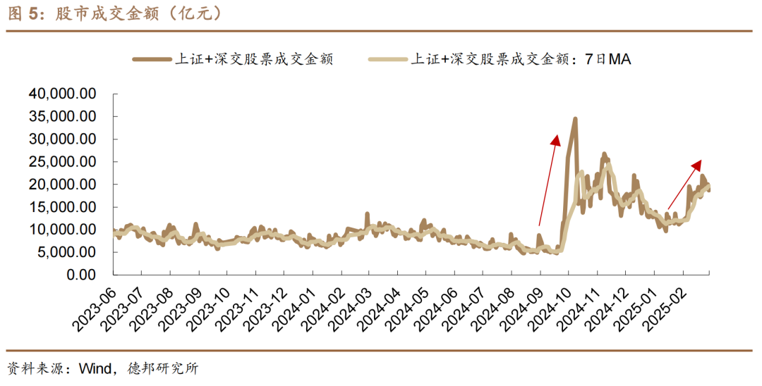 前年大行资金紧的时期,资金仍在银行间体系流转,本年由于阛阓风险偏好进步,资金向职权阛阓流入也较多。前年9月末职权阛阓大涨,股市成交金额昭彰攀升,国庆节后达到日度岑岭(2024/10/8两市统统成交3.5万亿),至前年年末发达回落,而本年以来,尤其是2月份股市成交额再度上行,近期日度成派遣近前年11、12月成交岑岭,职权阛阓资金昭彰发达流入。