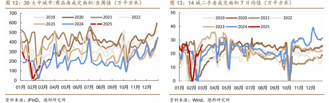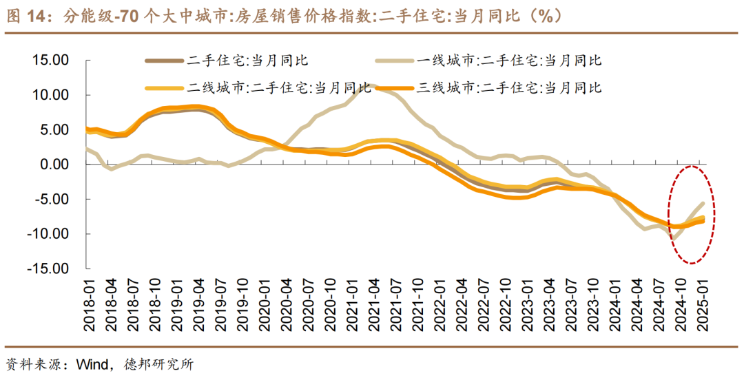 另一方面,从地产销售端来看二手成交位于季节性高位。收尾2月23日,30大中城市商品房成交面积164.16万平方米,环比前一周飞腾30.16%,较前月同期下行16.7%,较前年同期发达上行,二手成交发达好于新址,收尾3月1日,14城二手房成交面积7日均值环比前一周上行16.43%,昭彰高于前年同期,位于比年来季节性较高水平。价钱端,前年9月以来二手住宅价钱同比增速出现朝上设立趋势,其中一线城市先于其他城市回升,回暖动能相对较强,从前年9月的-10.7%上行至1月的-5.6%。