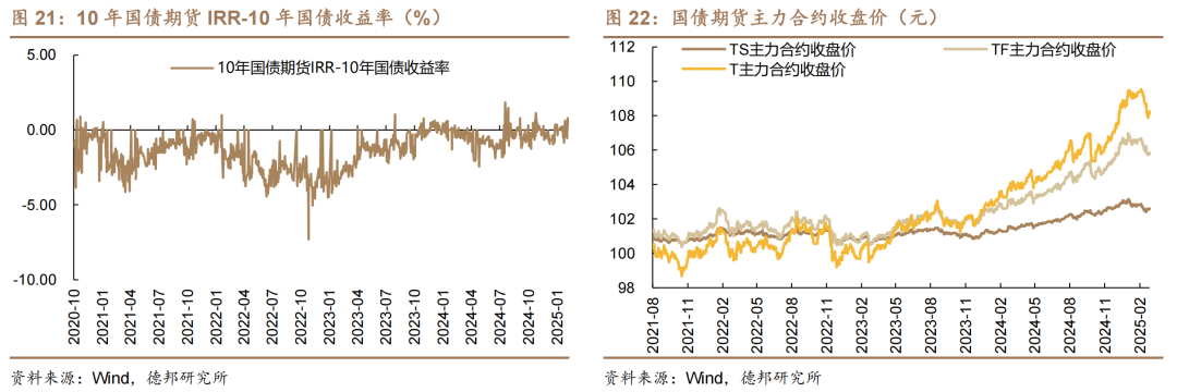 国债期货主力合约全线收涨。具体而言,2月24日-2月28日,10年国债期货IRR-10年国债收益率较上周上行0.36个百分点,TS、TF、T主力合约收盘价较上周上行0.04%、上行0.02%、上行0.09%。