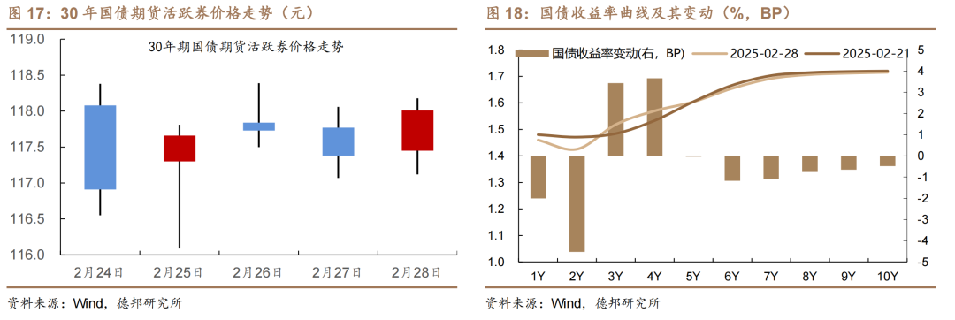 周五(2/28)央行开展2845亿元7天逆回购操作,当日净投放1020亿元,资金面旯旮转松,受关税讯息影响职权阛阓回调,债市走强,当日现券收涨,银行间主要利率债收益率浩繁下行,10Y期国债利率下行4.24BP至1.72%;